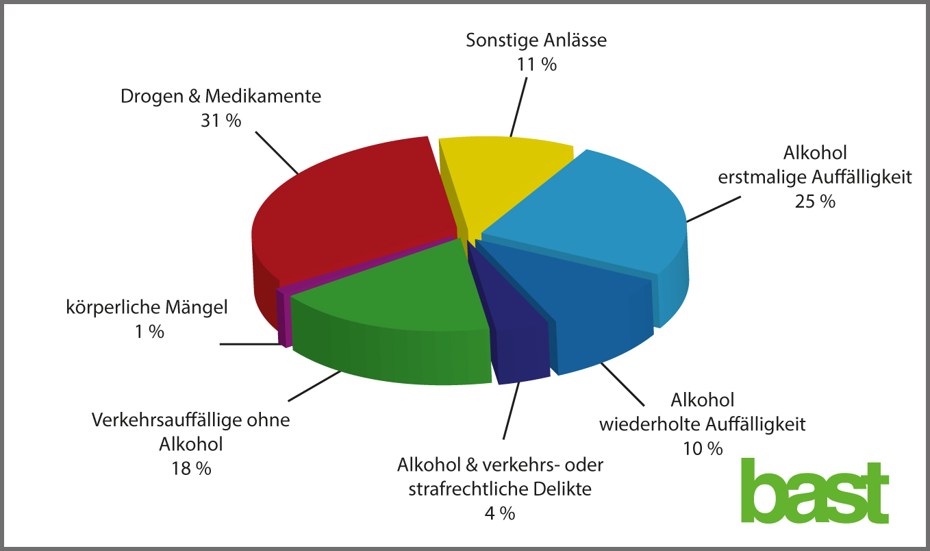 Die Bundesanstalt für Straßenwesen (BASt) veröffentlicht jährlich eine Statistik über die MPU. Aus dieser geht hervor, wie viele Begutachtungen es gegeben hat, welche Fragestellungen zugrunde lagen und wie viele positive oder negative Gutachten dabei herauskamen. Im Jahr 2014 lag die Zahl der durchgeführten MPUs bei 91.536 (Quelle der BASt). In der Grafik unten sehen Sie, welche Untersuchungsanlässe es 2014 gegeben hat.